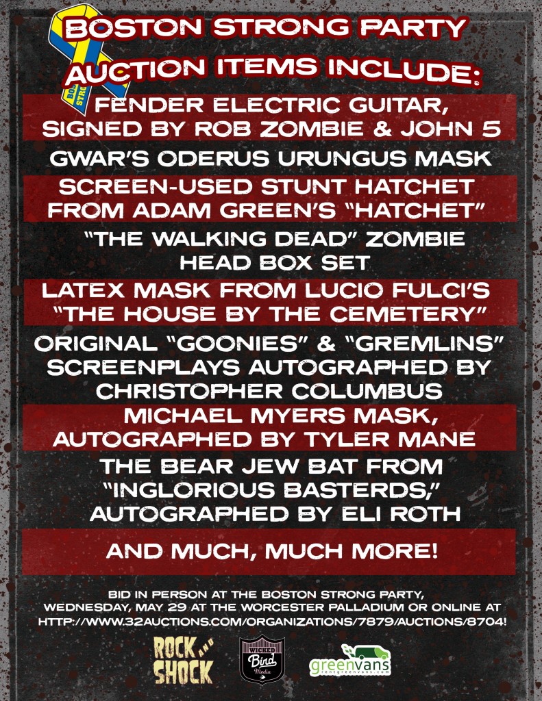 Other items include: Rock & Shock 2013 VIP passes, autographed memorabilia, DVDs, books, apparel and posters, horror home decor, gift cards and more!